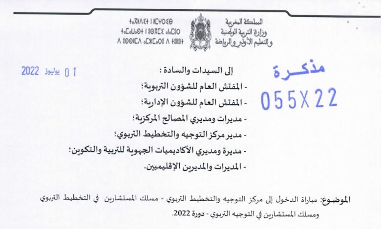 أصدرت وزارة التربية الوطنية والتعليم الأولي والرياضة المذكرة رقم  055×22 بتاريخ 01 يوليوز 2022 التي تعلن فيها عن تنظيم مباراة الدخول إلى مركز التوجيه والتخطيط التربوي – دورة 2022 لمسلكي التوجيه التربوي والتخطيط التربوي.